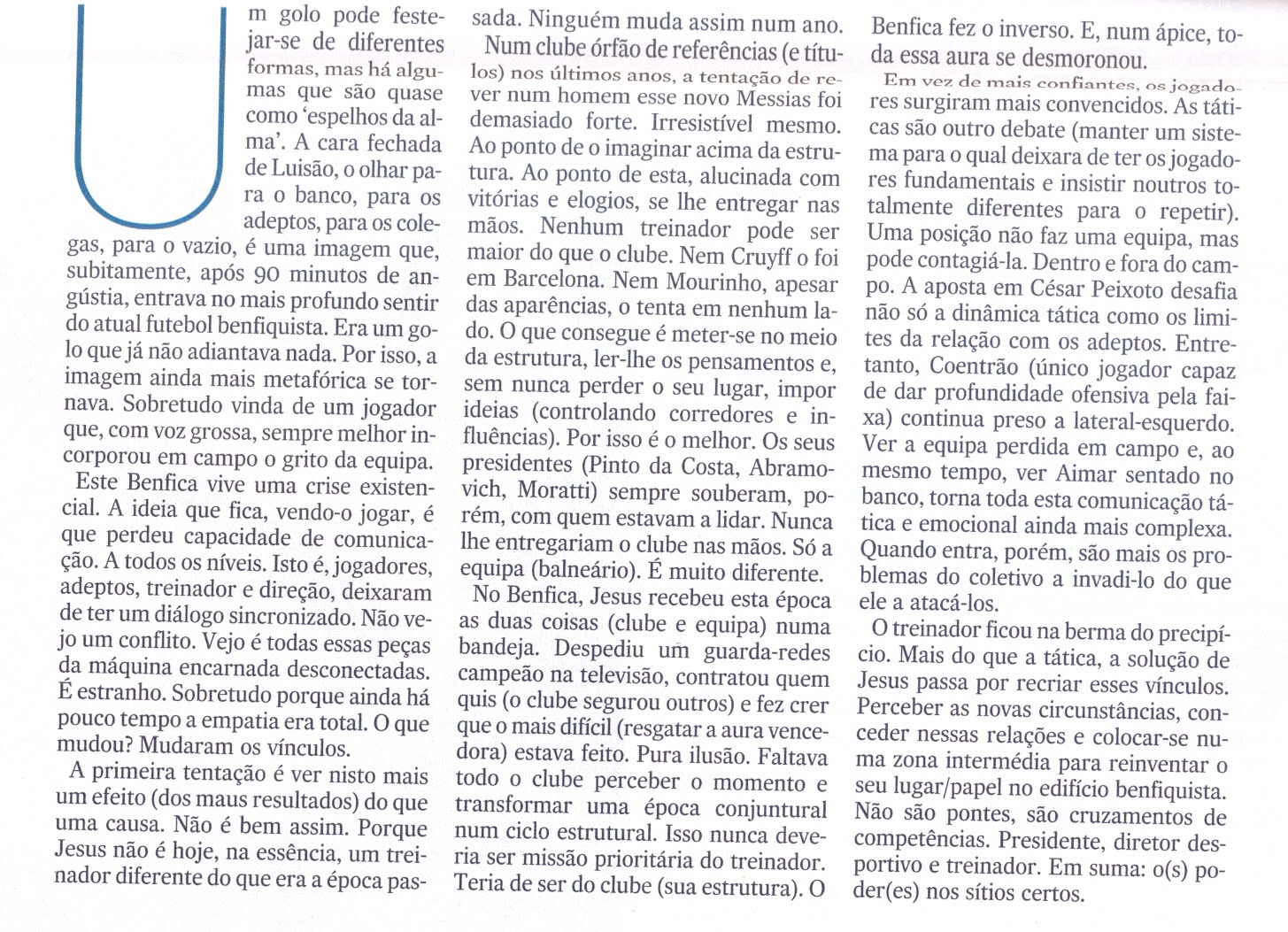 "Há uma semana, antes de receber o Braga, o mundo benfiquista estava com o coração nas mãos. A "luz desconectada" (entenda-se comunicação turvada no circuito treinador-presidente-jogadores-adeptos) ameaçava o treinador herói de meses antes. 90 minutos depois, Jesus parecia ter nascido de novo. Antes, o voto de confiança do presidente e o treinador reconhecendo a responsabilidade. Faltava em campo a resposta dos jogadores. Sem deslumbrar, o 11 controlou sempre o jogo. Na bancada, embora longe da euforia, os adeptos sorriam. E quando perto do fim a bola parecia entrar, Júlio César fez a defesa-milagre e deu sentido aos saltos e gritos que durante todo o jogo marcaram o renascimento do estilo eléctrico de Jesus.